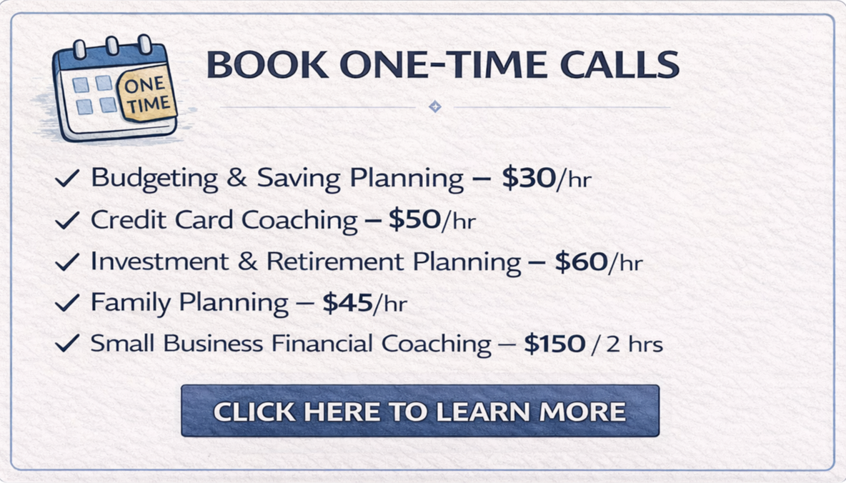 You can use your call for budgeting, saving, credit cards, debt questions, investing basics, planning for big expenses, small business finances, or general money questions. Your focus can change from call to call.